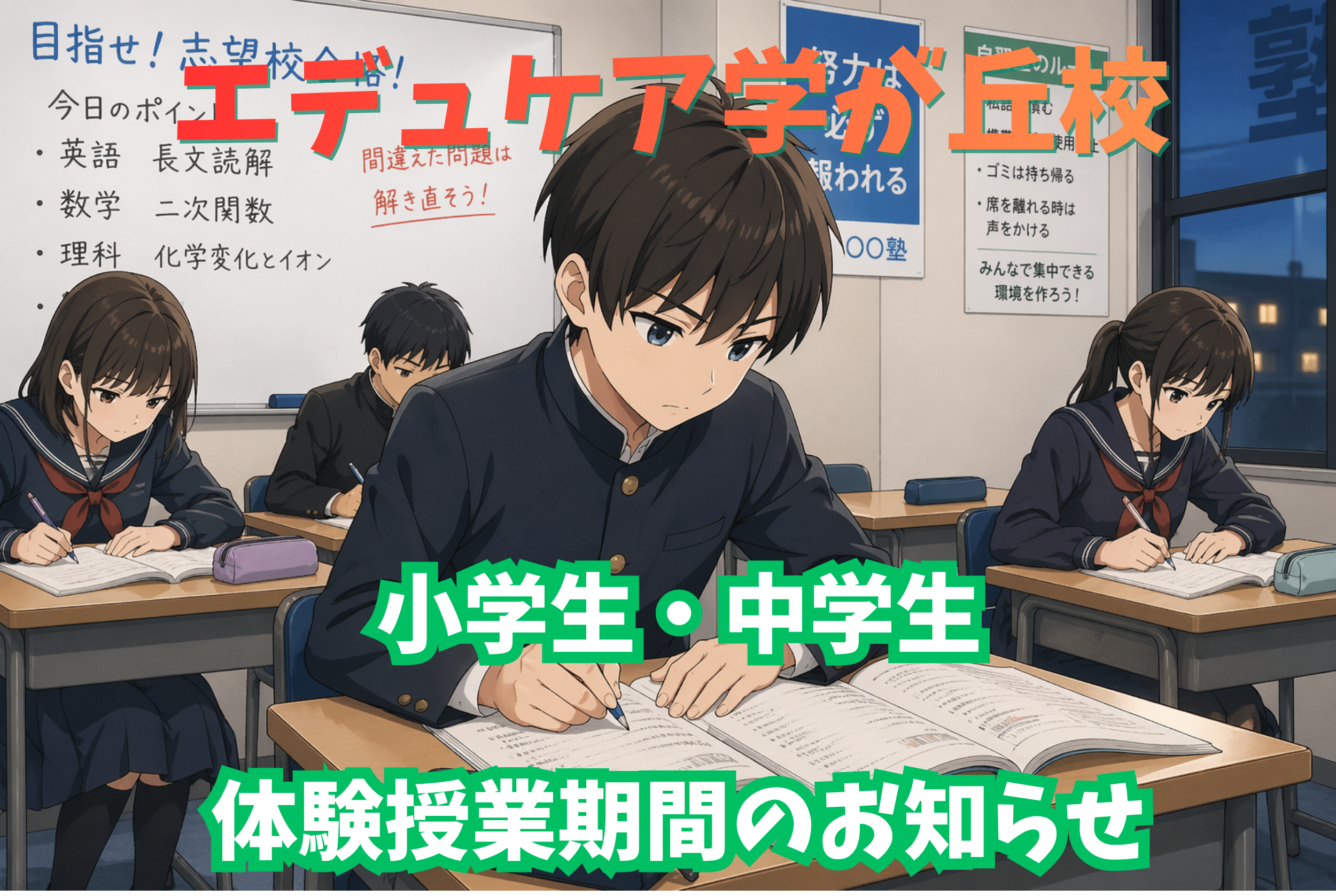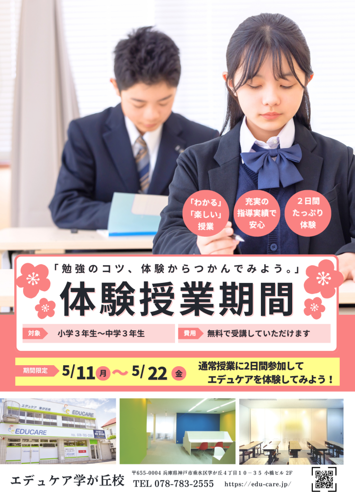 エデュケアでは、小学三年生から中学三年生を対象に、5月11日(月)から5月22日(金)まで無料体験授業を実施します。期間中は、実際の通常授業に2日間参加でき、教室のようすや学習の流れをそのまま体験していただけます。ここでは、体験授業で得られるポイントを分かりやすくまとめました。